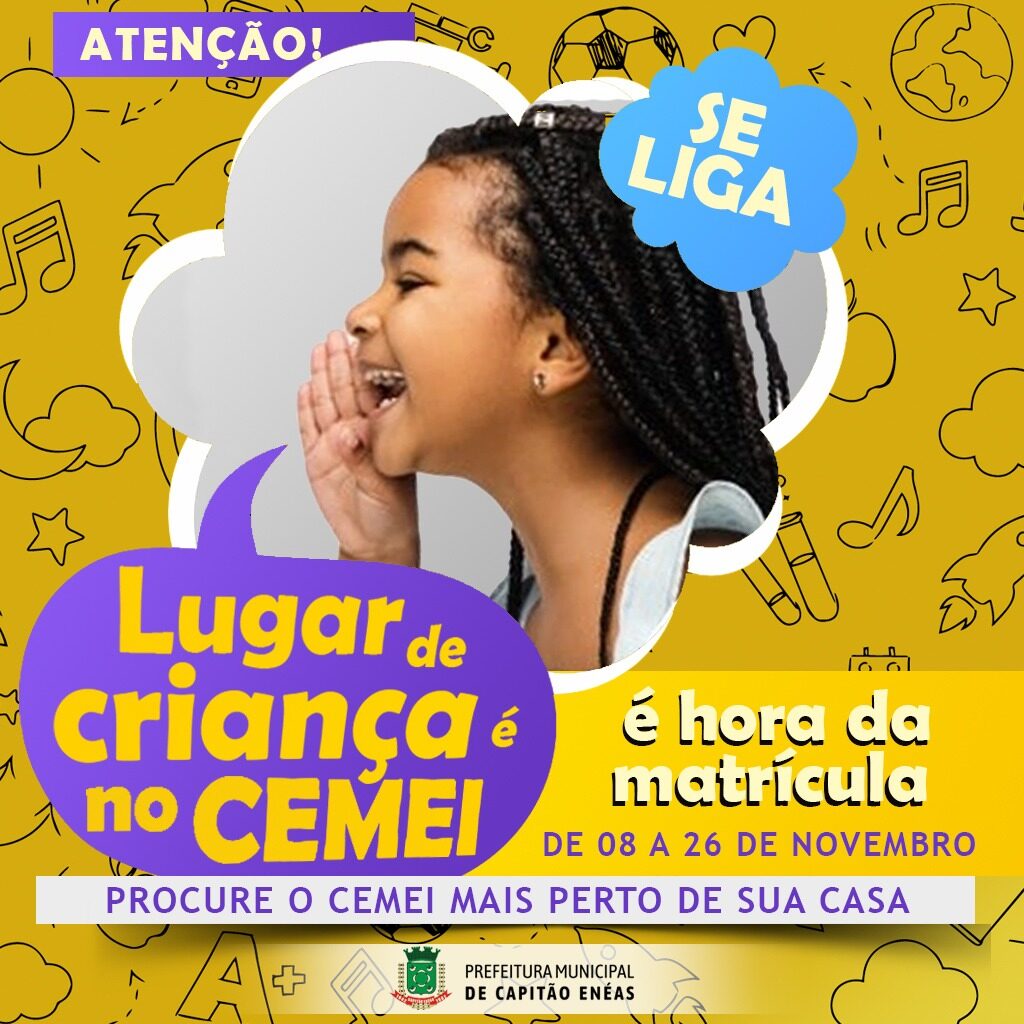 A prefeitura de Capitão Enéas, já começou nesta segunda (08), a campanha de matrículas da educação infantil. O prazo vai até o dia 26 de novembro. Procure o CEMEI mais próximo de sua casa para fazer a matrícula do seu filho. Lugar de Criança é na Escola. INFORMAÇOES (38) 99994-3365