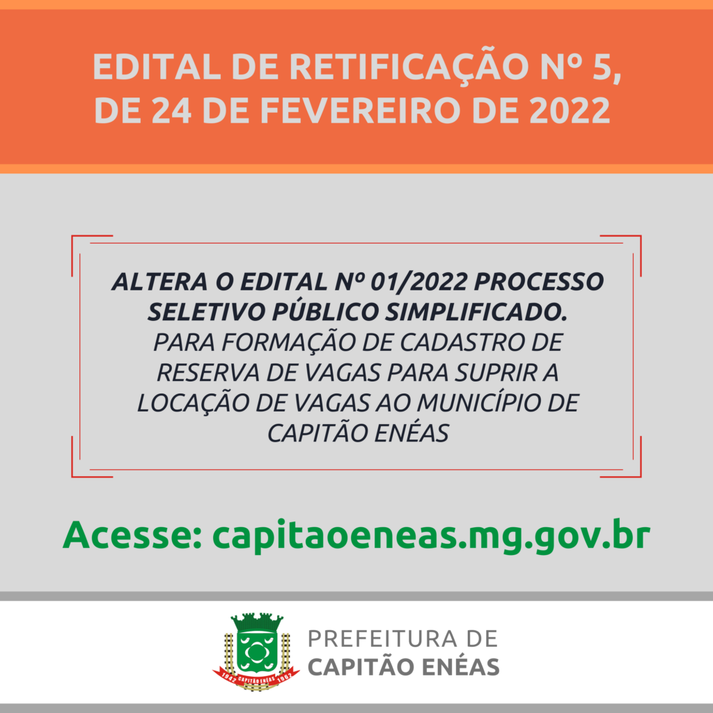 ALTERA O EDITAL Nº 01/2022 PROCESSO SELETIVO PÚBLICO SIMPLIFICADO. PARA FORMAÇÃO DE CADASTRO DE RESERVA DE VAGAS PARA SUPRIR A LOCAÇÃO DE VAGAS AO MUNICÍPIO DE CAPITÃO ENÉAS