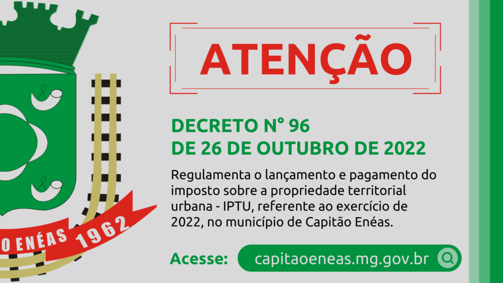 REGULAMENTE O LANÇAMENTO E PAGAMENTO DO IMPOSTO SOBRE A PROPRIEDADE TERRITORIAL URBANA – IPTU, REFERENTE AO EXERCÍCIO DE 2022, NO MUNICÍPIO DE CAPITÃO ENÉAS/MG