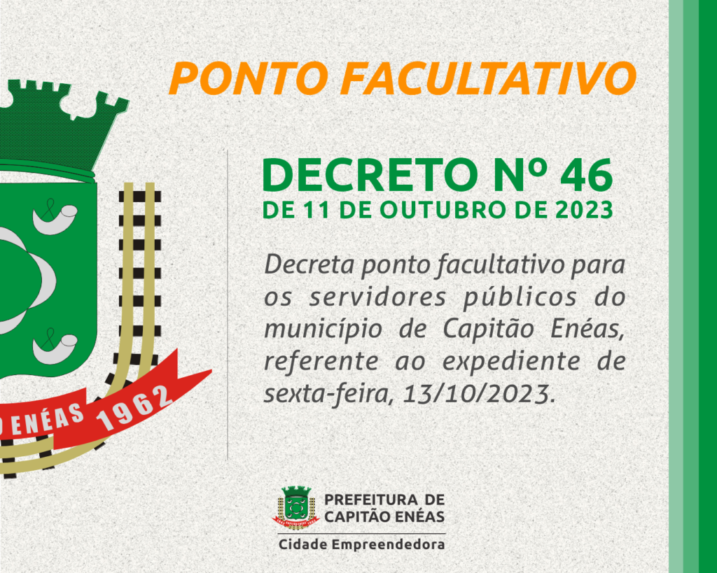 O Prefeito do município de Capitão Enéas, no Estado de Minas Gerais, senhor Reinaldo Landulfo Teixeira, no uso de suas atribuições conferidas pela Lei Orgânica Municipal decreta ponto facultativo nas repartições públicas municipais no dia 13 de outubro de 2023, estendendo o feriado de Nossa Senhora Aparecida, no dia 12 do corrente mês. O mesmo […]