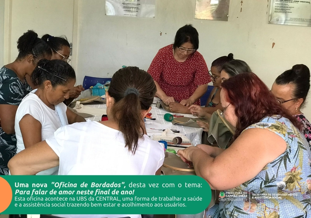 Uma nova “Oficina de Bordados”, desta vez com o tema: Para falar de amor neste final de ano! Esta oficina acontece na UBS da CENTRAL, uma forma de trabalhar a saúde e a assistência social trazendo bem estar e acolhimento aos usuários.